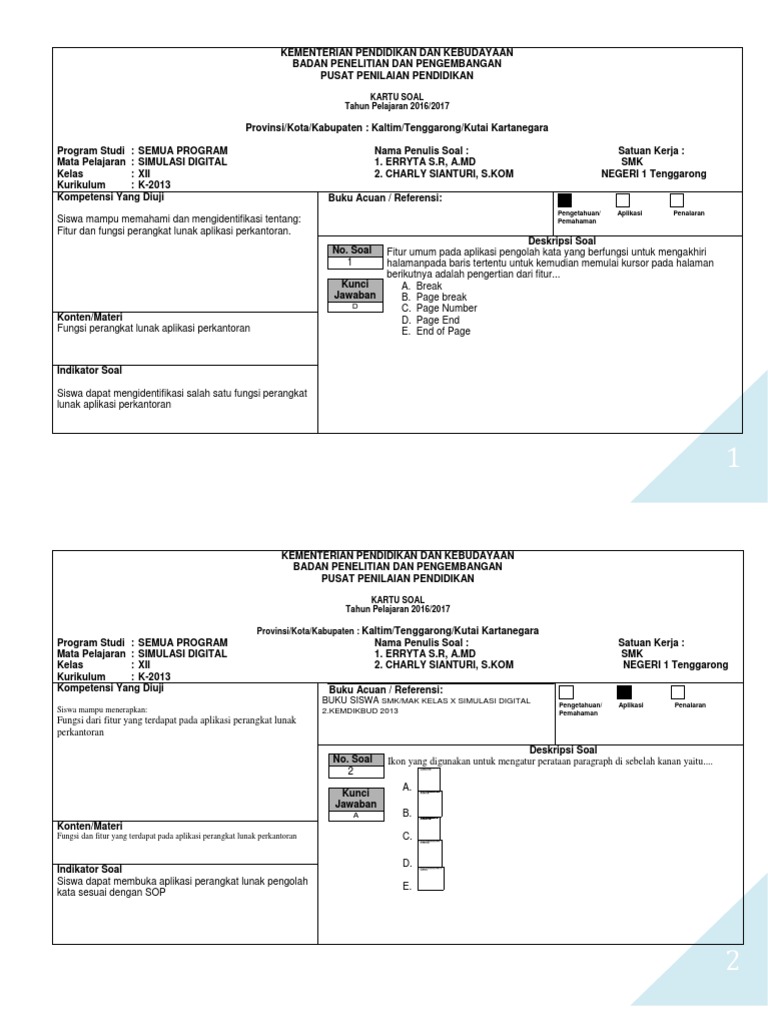 Kartu soal smk k13 revisi. Aplikasi Soal Kartu Soal Kisi-Kisi dan Kunci Jawaban Otomatis Bahrudin Achmad November 16 2014 127 comments Aplikasi ini mempermudah para guru untuk membuat administrasi soal yang meliputi. Soal UTS Pemrograman berbasis dekstop kelas XI 2017-2018docx.