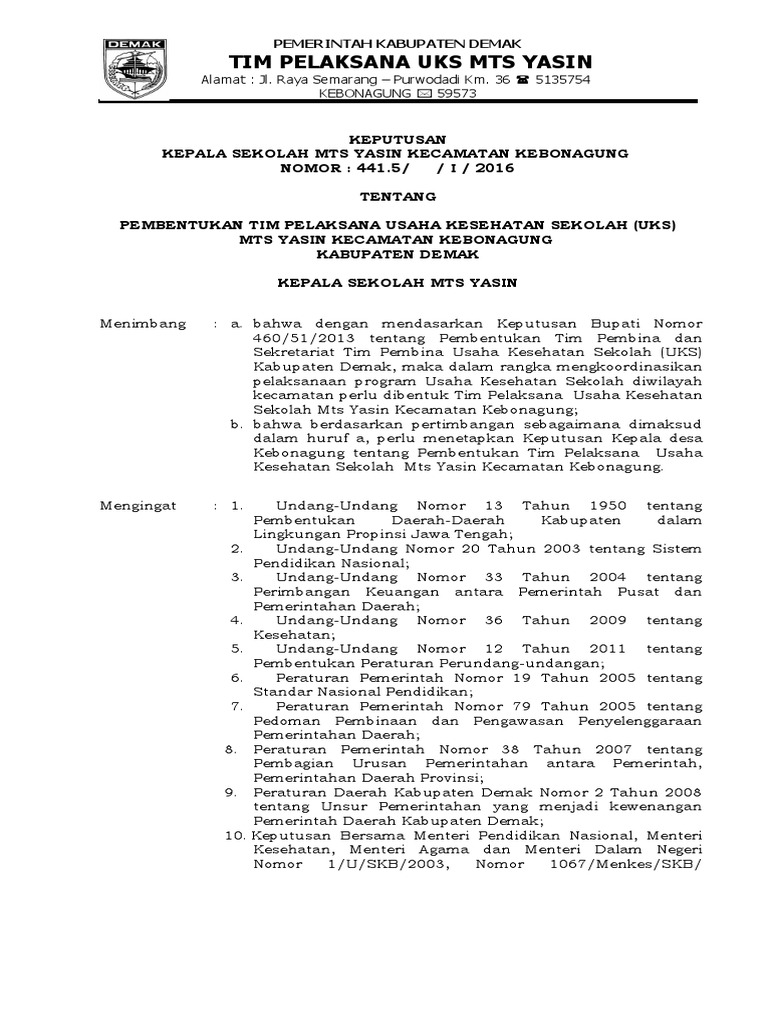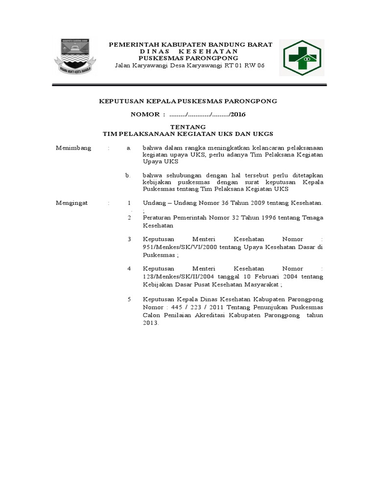 Cari di dalam dokumen -1-PEMERINTAH KABUPATEN WONOGIRI. Bahwa dalam rangka melakukan pembinaan terhadap Usaha Kesehatan Sekolah maka Tim Pelaksana Usaha Kesehatan Sekolah membentuk kepengurusan Tim Pelaksana Usaha Kesehatan Sekolah. Untuk melengkapi postingan dengan informasi yang relevan maka sebelumnya akan akan dibahas terlebih dahulu definisi SK surat keputusan pembentukan tim UKS SD fungsi kegunaan manfaatnya komponen SK contoh format dan dokumennya dalam bentuk doc.